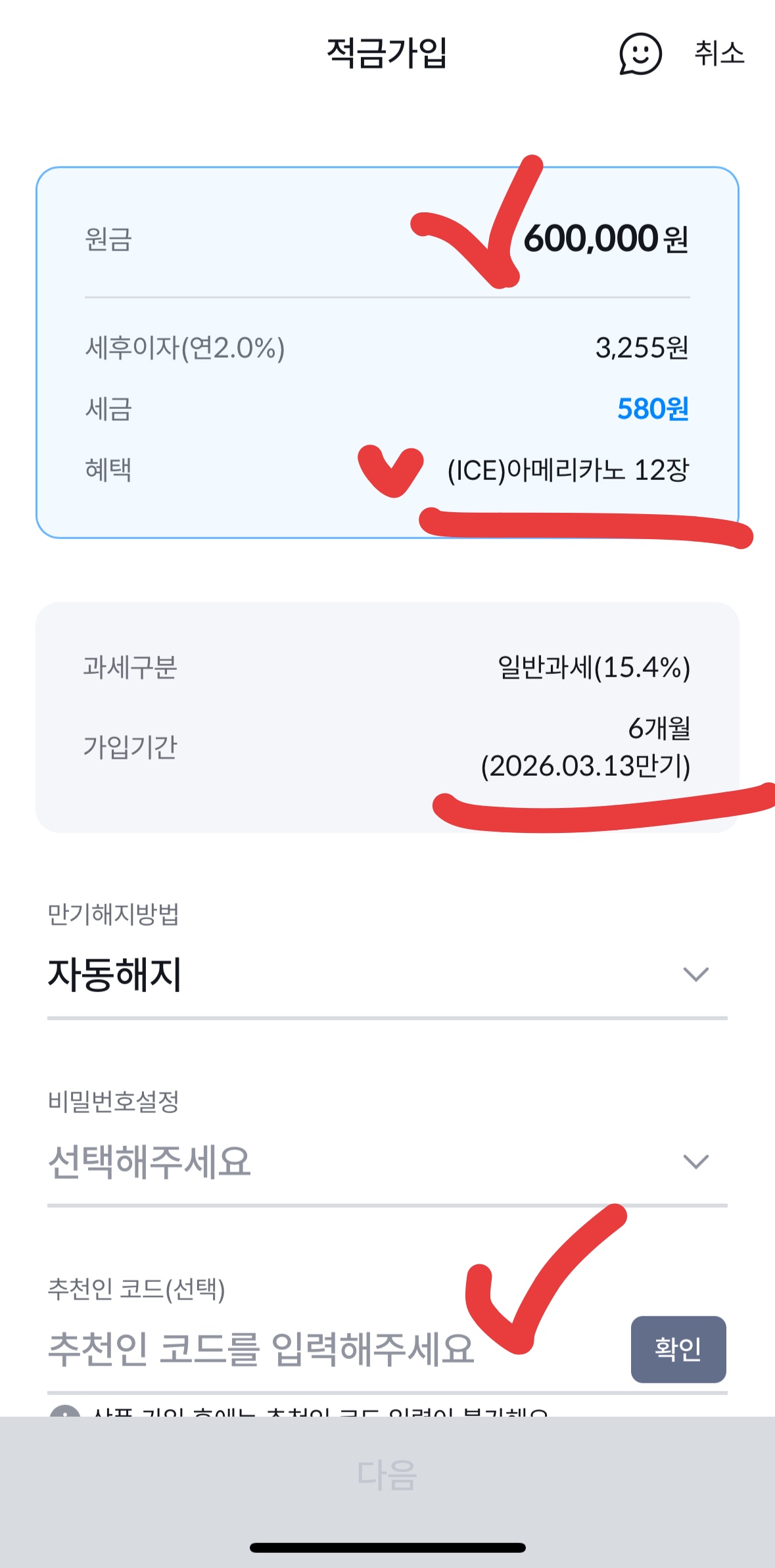 - 만기 유지 필수: 6개월 만기를 채우지 못하고 중도해지 시, 연 0.2%의 기본 금리만 적용되고 커피 쿠폰 혜택도 받을 수 없습니다. 소액이라도 반드시 6개월간 유지할 수 있는 자금으로 계획하시길 바랍니다.