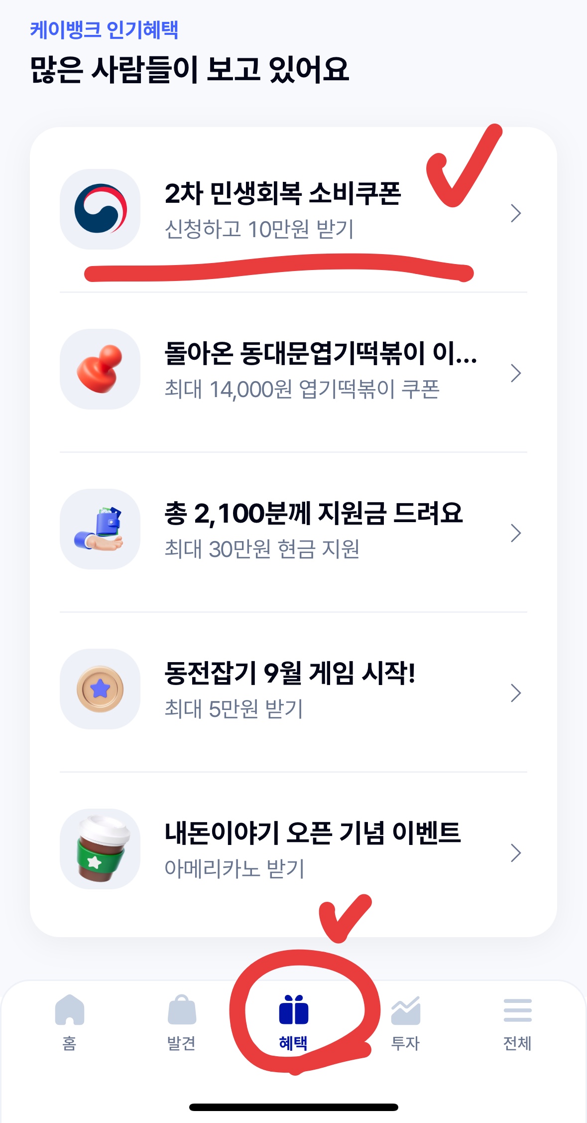 1. '혜택' 탭에서 '소비쿠폰' 배너 클릭 K뱅크 앱 하단 혜택을 누르고 → 상단에 보이는 '2차 민생회복 소비쿠폰' 배너를 누릅니다.