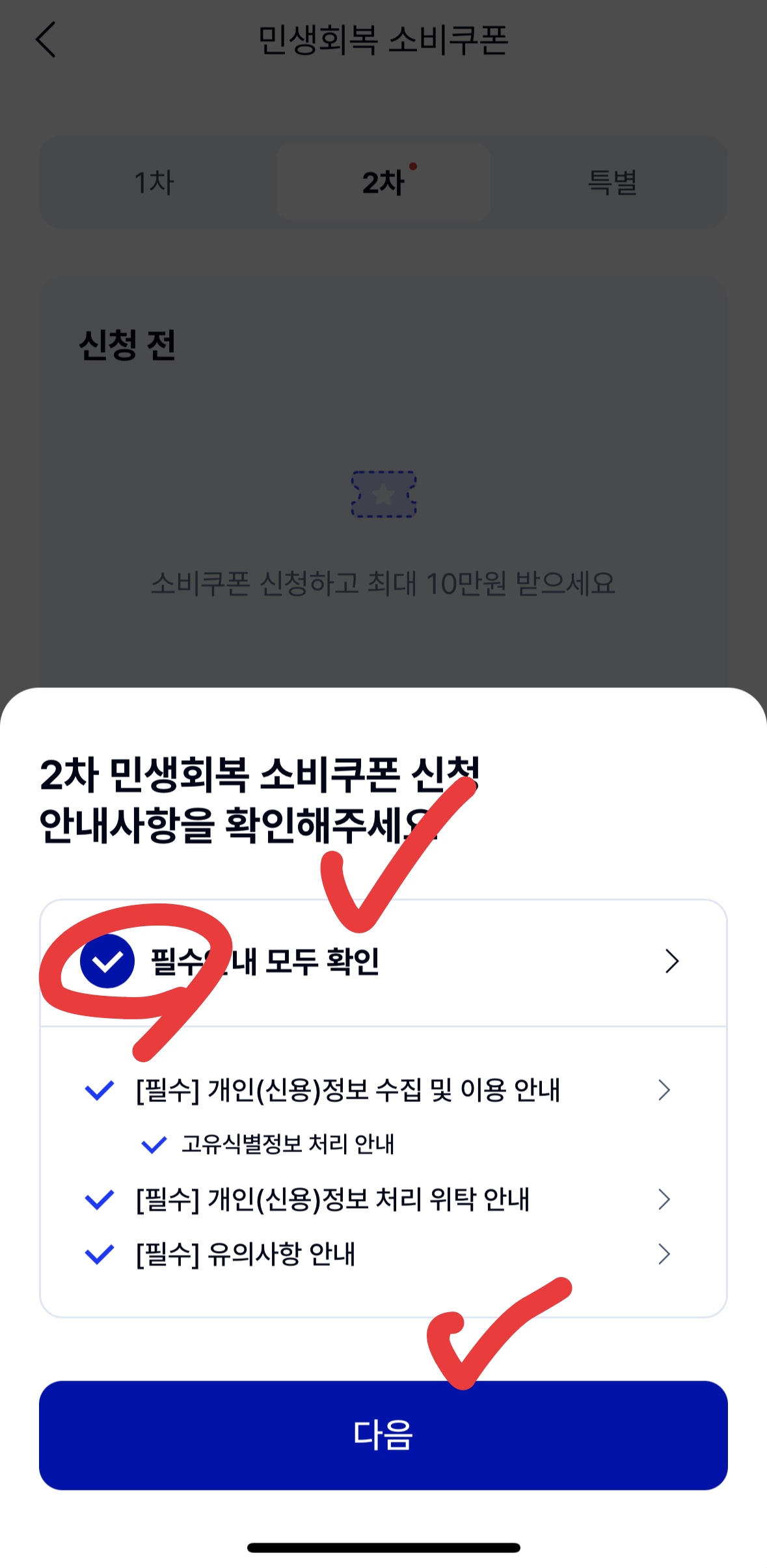 2. 필수 안내 확인 및 동의 '필수 안내 모두 확인' 항목에 ✔️ 체크한 후 → 파란색 '다음' 버튼을 누릅니다.
