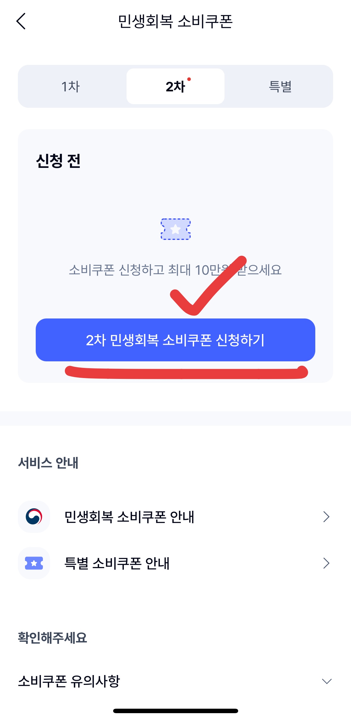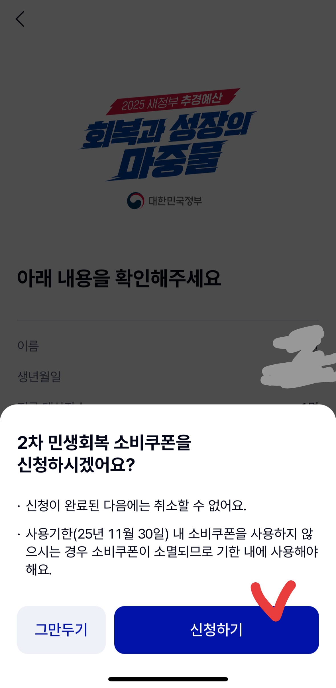 4. '신청 완료' 화면 확인 "2차 민생회복 소비쿠폰 신청을 완료했어요"라는 문구가 나오면 정상적으로 접수된 것입니다.