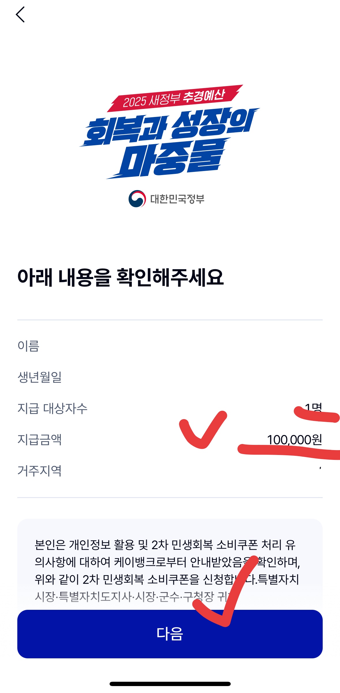 3. 신청 내용 확인 후 최종 '신청하기' 지급 금액 100,000원 등 표시된 내용을 확인하고 **'다음'**을 누릅니다 → 마지막 팝업창에서 '신청하기'를 누릅니다.